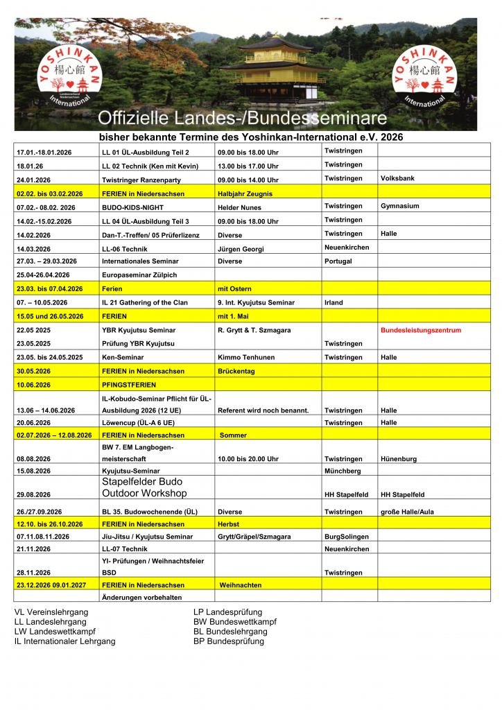 Events, seminars and dates of Yoshinkan-International e.V. and its cooperation partners Vorläufige TerminePeriod2026VenueDiverseOrganiser / Organizer PDF Bundes-Dan-Träger Treffen Yoshinkan-InternationalPeriod15.02.2026VenueTwistringenDiverseOrganiser / OrganizerYoshinkan-International Ausschreibung SeminarPeriod14.03.2026VenueNeuenkirchen Ausschreibung Bundesleistungszentrum Kyujutsu-SeminarPeriod22. Mai. 2026VenueSports hall Am Mühlenacker in 27239 Twistringen Germany Ausschreibung (D) 8. Twistringer Kenjutsu-SeminarPeriod 23. und 24. Mai 2026VenueSports hall Am Mühlenacker in 27239 Twistringen Germany Ausschreibung (D) Ausschreibung (E) Kobudo SeminarPeriod13. bis 1. Juni 2026VenueSports hall Am Mühlenacker in 27239 Twistringen Germany Ausschreibung und Anmeldung erfolgt noch Ausschreibung und Anmeldung Englisch erfolgt noch 7. /EuropameisterschaftDate08. August 2026VenueAm Ringwall 43 in 27239 Twistringen (Hünenburg) GermanyOrganizer: Yoshinkan-InternationalHost: Budo Shin Dojo SCT Ausschreibung -D Ausschreibung -E 35. Budowochenende TwistringenPeriod26.–27. September 2026VenueSports hall Am Mühlenacker in 27239 Twistringen Germany Ausschreibung zum Download Ausschreibung zum Download (E) Aushang zum Download (D) Aushang zum Download (E) Ausschreibung PDF Ausschreibung PDF Bundes und Landesprüfungen 2026 Zeitraum 28.11.2026 Austragungsort Twistringen Ausschreibungfolgt Ausschreibung Ausschreibung Gib hier deine Überschrift ein Gib hier deine Überschrift ein Gib hier deine Überschrift ein Gib hier deine Überschrift ein Gib hier deine Überschrift ein